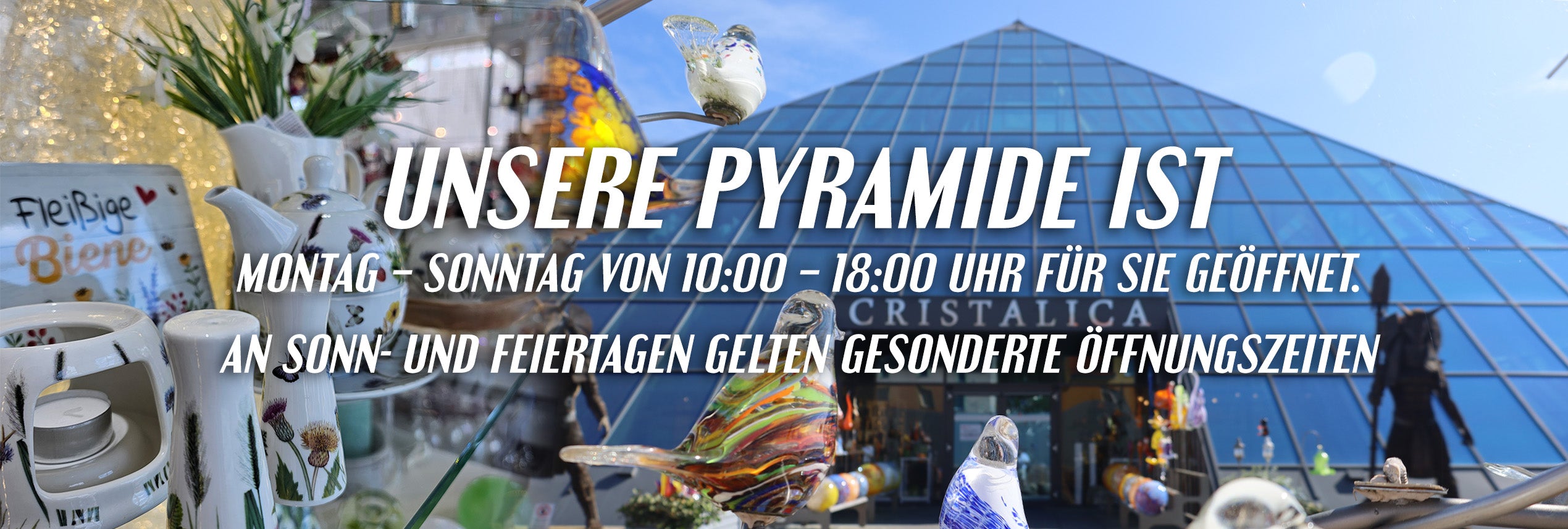 Die gläserne Pyramide ist das Wahrzeichen unseres Unternehmens. Das beeindruckende Bauwerk, gefüllt mit modernen und traditionellen Glasprodukten und eine Führung durch unsere Glashütte ist immer eine Reise wert.
